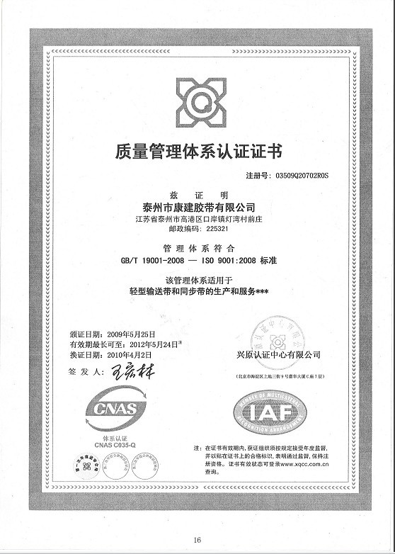 泰州市康建膠帶有限公司經(jīng)過十多年的發(fā)展已經(jīng)成為一家從事輸送帶和傳動帶類及相關(guān)設(shè)備生產(chǎn)和銷售的公司。位于中國經(jīng)濟發(fā)達的長三角經(jīng)濟圈江蘇省泰州市高港區(qū),交通發(fā)達。我司以“合格的產(chǎn)品,滿意的服務(wù)”為宗旨,發(fā)揚團結(jié)、開拓、拼搏爭先的創(chuàng)業(yè)精神,“康建”在全國行業(yè)樹立了良好的企業(yè)形象?!翱到ā碑a(chǎn)品已通過ISO9001國際質(zhì)量體系認(rèn)證,從原料﹑工藝等方面進行了嚴(yán)格的控制,從而確保了產(chǎn)品質(zhì)量的穩(wěn)定可靠,成為各......